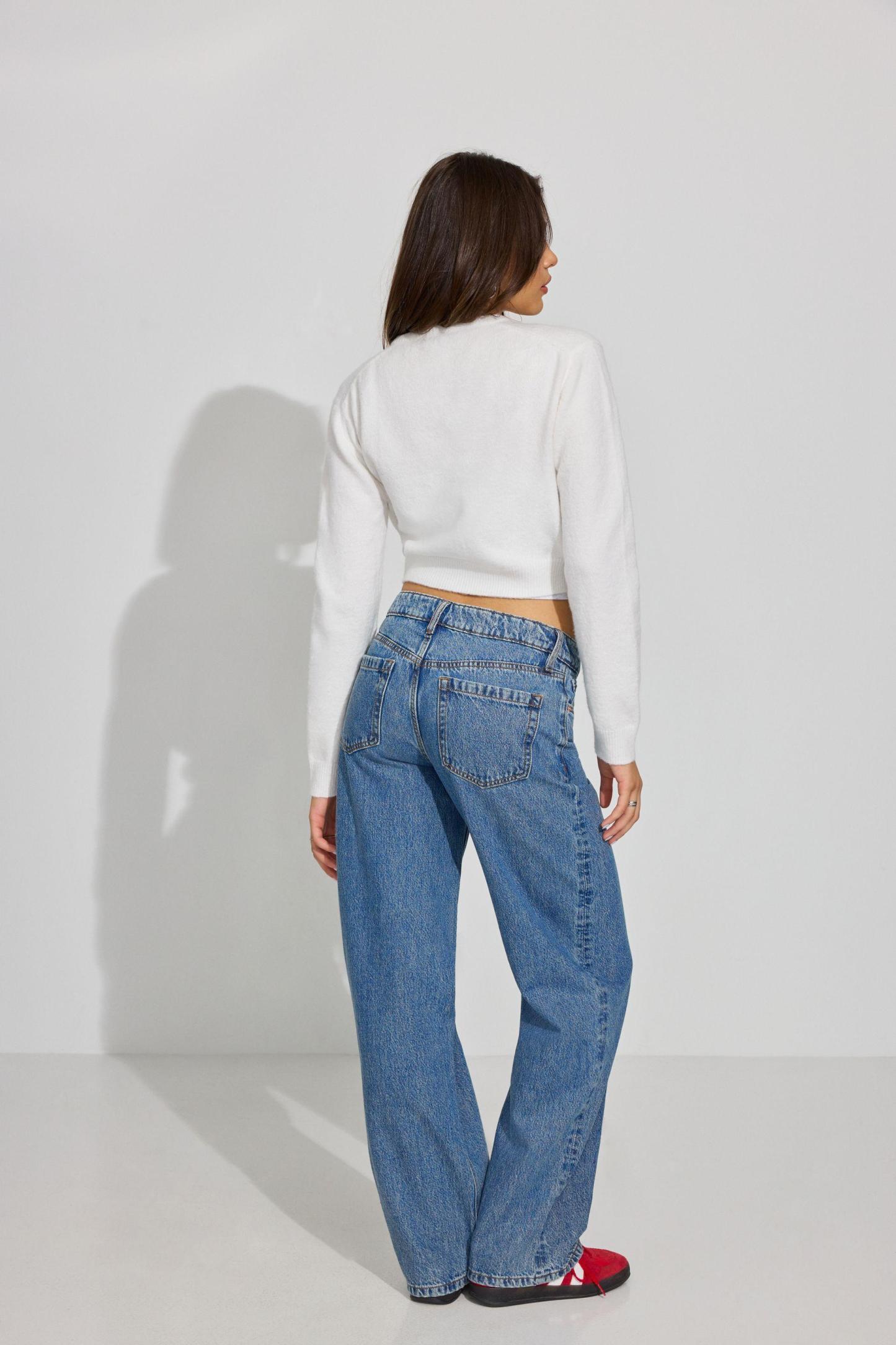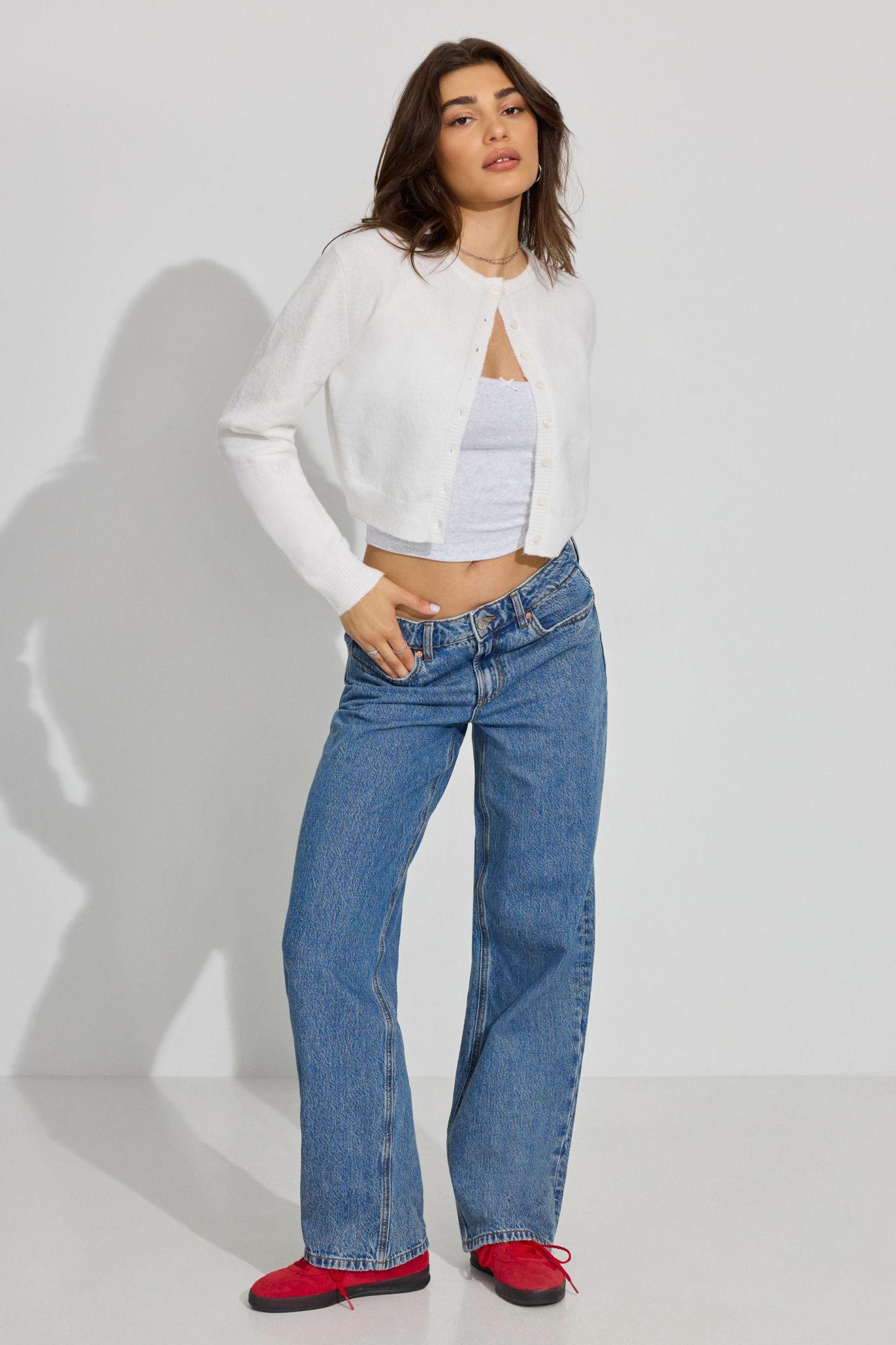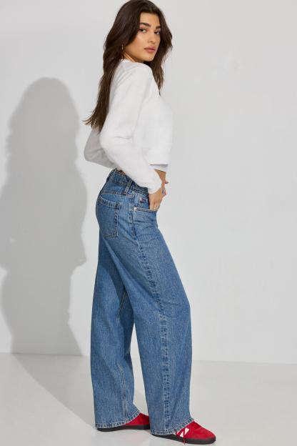 These baggy fit jeans sit low on the hips and come with a bigger, full-length leg that bunches at the bottom. Perfect for your biggest sweater or your tiniest shirt.