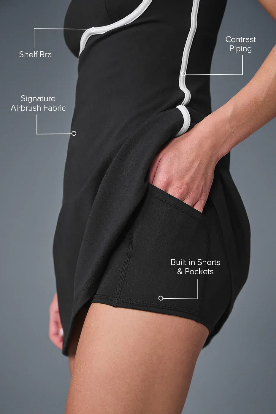 How cute is this dress? From the contrasting piping to the adorable A-line fit that swoops in at the waist and eases out through the hips, there��s nothing not to love. It's practical, too, with built-in shorts (plus pockets) and a shelf bra with removable cups. And the Airbrush fabric is smoothing but not overly compressive��prime for working out or wearing out.